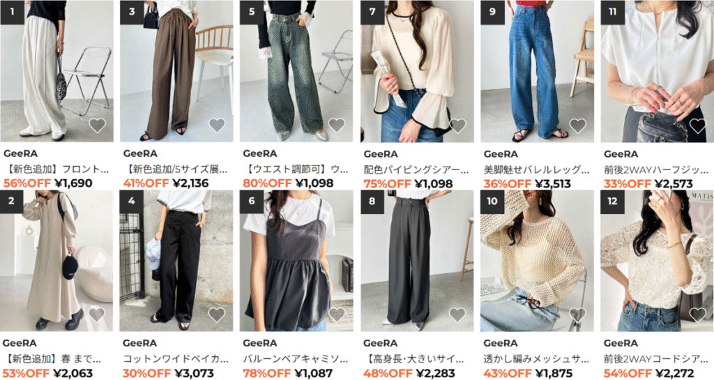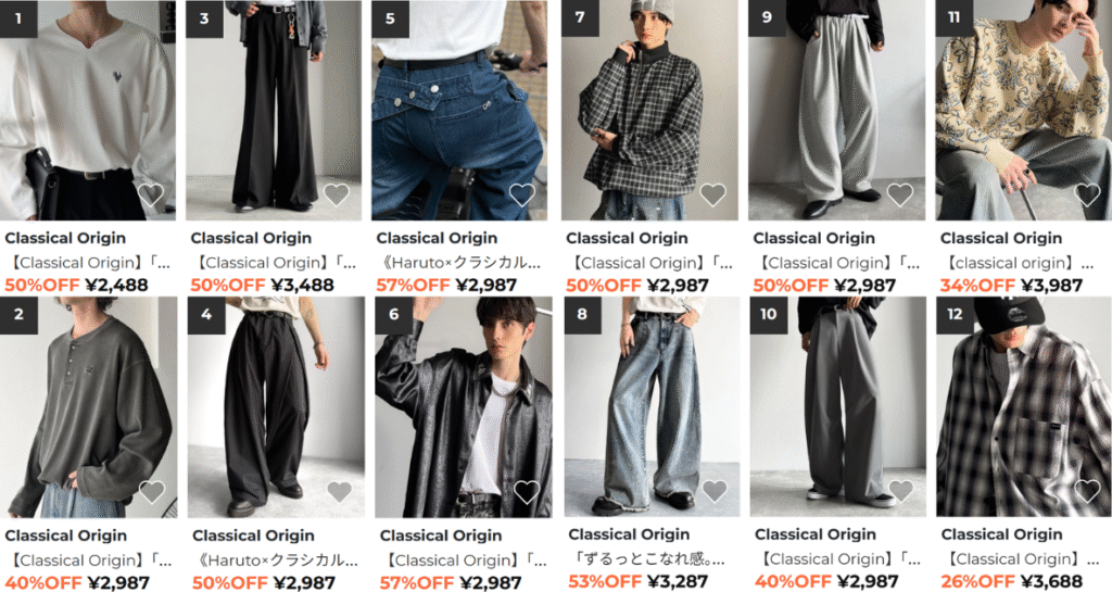 手頃な価格でトレンドを取り入れたアイテムを展開し、特に「2タックスラックス」などのパンツが人気です。