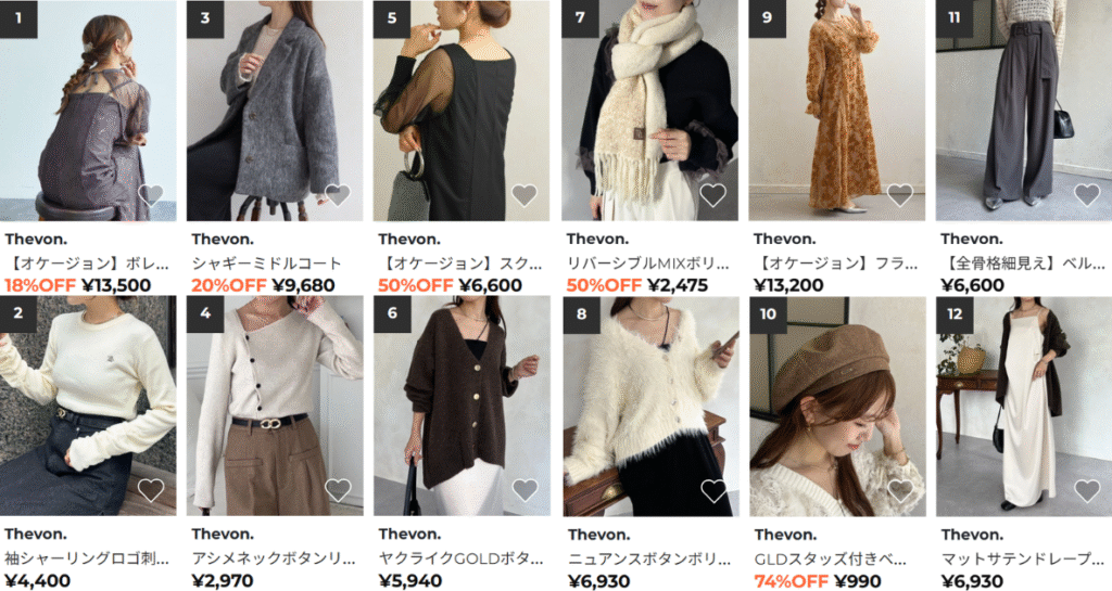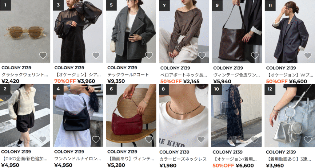 20代~40代に人気で、大人向けのファッションアイテムが多いです。